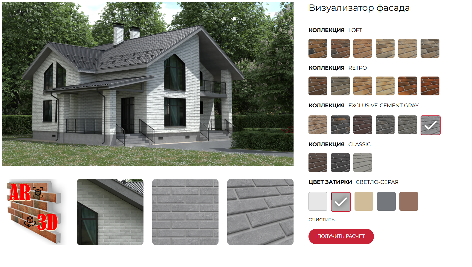 • В реальном времени подбирать облик своего будущего фасада, перебирая 21 вариант плитки и несколько цветов затирки.