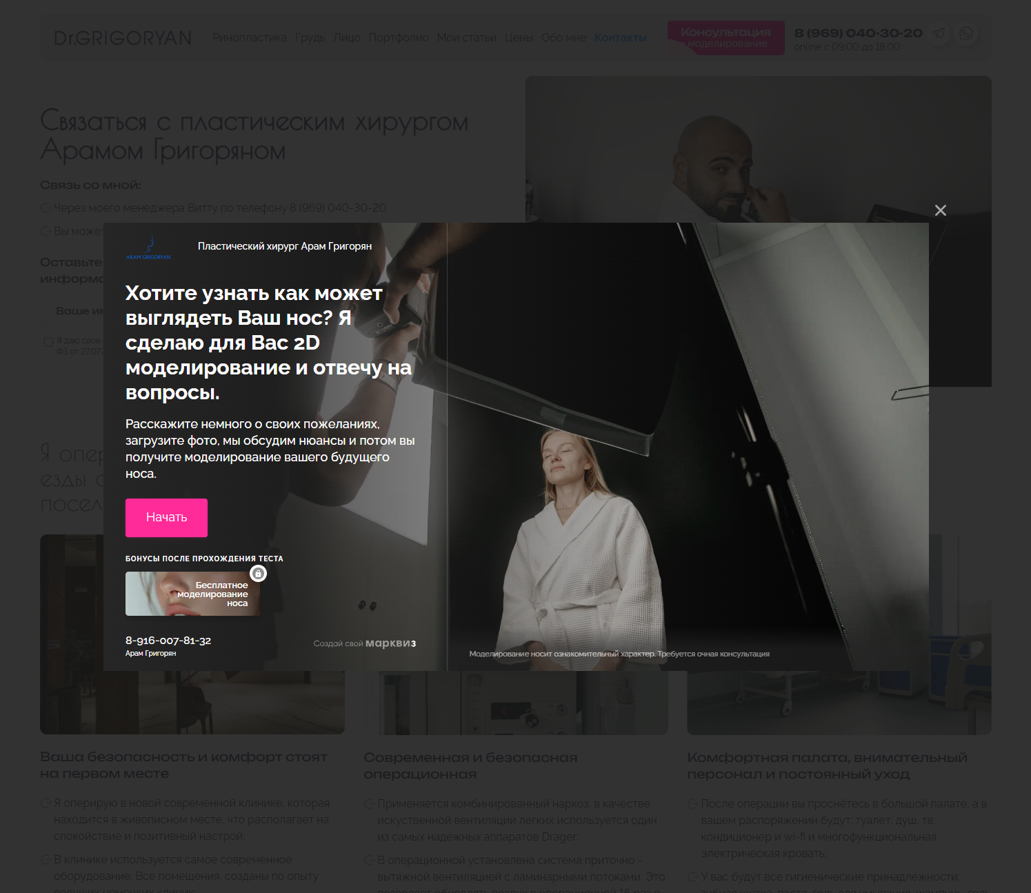 Отдельного внимания заслуживает лид магнит. В шапке сайта есть кнопка «Консультация + моделирование». Изначально это называлось моделирование носа. Суть в том, что мы в квизе задавали лиду вопросы о носе, о пожеланиях, о перенесённых операциях и просили загрузить два фото: в профиль и анфас. После чего Арам проводил компьютерное моделирование носа и это и было крутым магнитом.