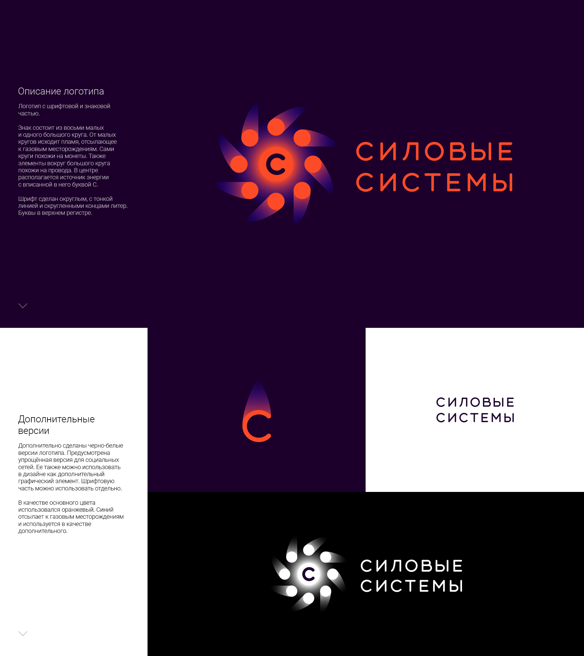 В знаке восемь малых кругов формируют движение и ассоциируются с пламенем, проводами и монетами одновременно. В центре расположен круг с буквой «С» — символ ядра и силы. Логотип получился универсальным: он легко читается в любом масштабе, смотрится технологично и современно.