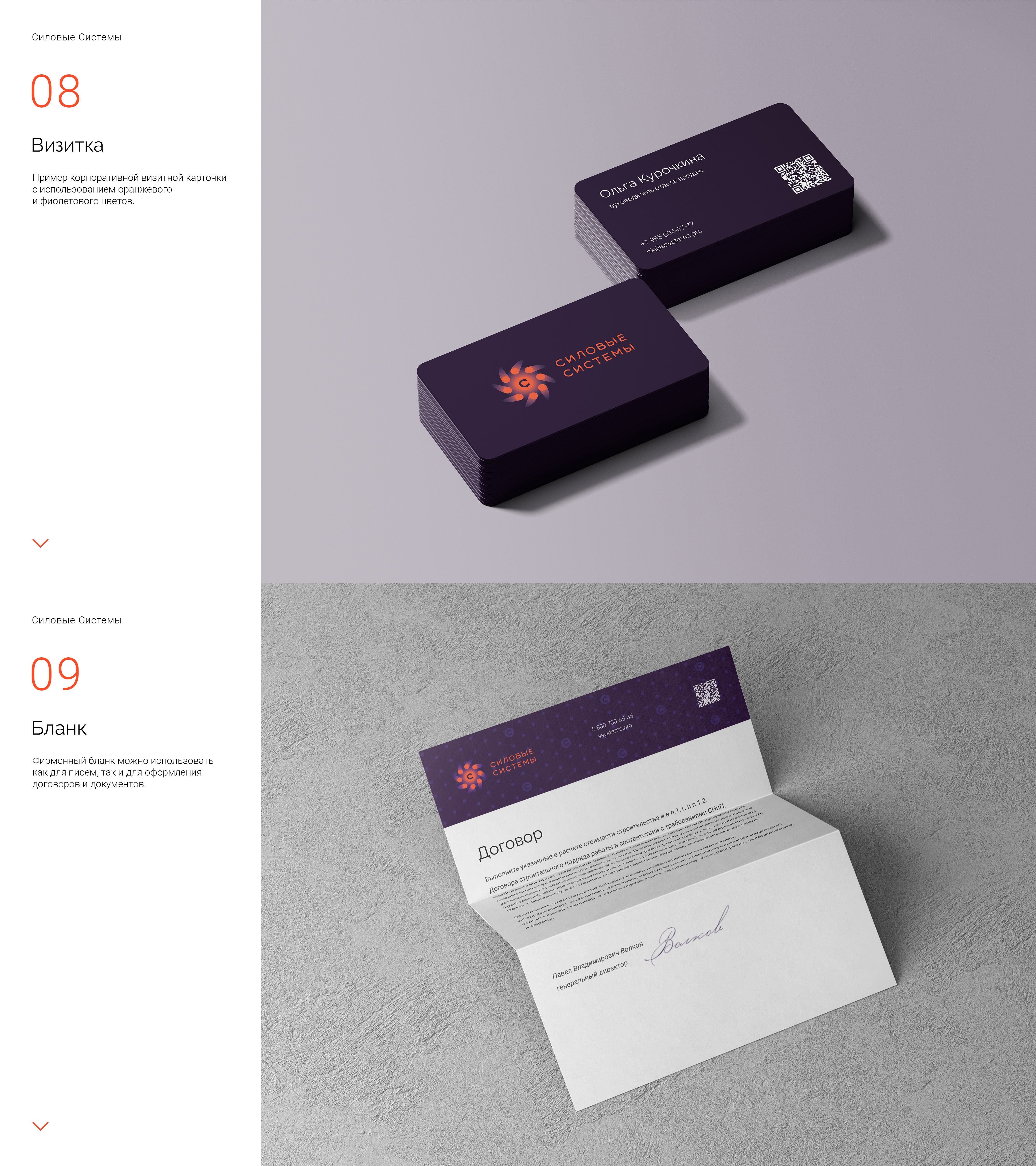 Дальше я выстроила целостную систему: подобрала цветовую палитру (глубокий фиолетовый и акцентный оранжевый), разработала модульный паттерн, продумала фирменный блок, шрифтовую иерархию. Всё это позволило бренду выглядеть цельно и уверенно — от визиток и корпоративных материалов до цифровых каналов.