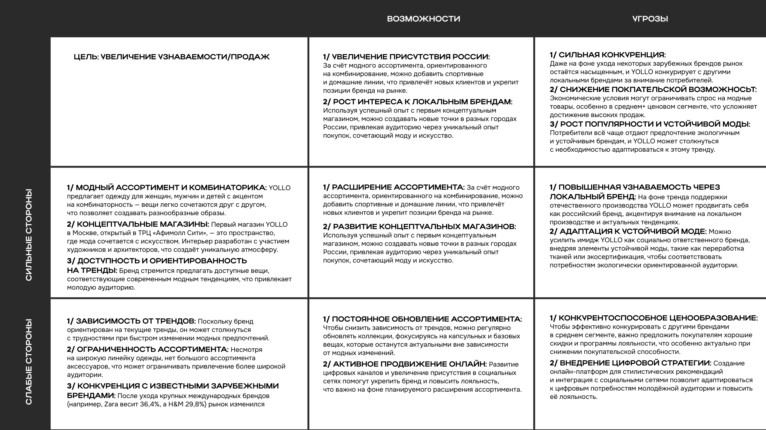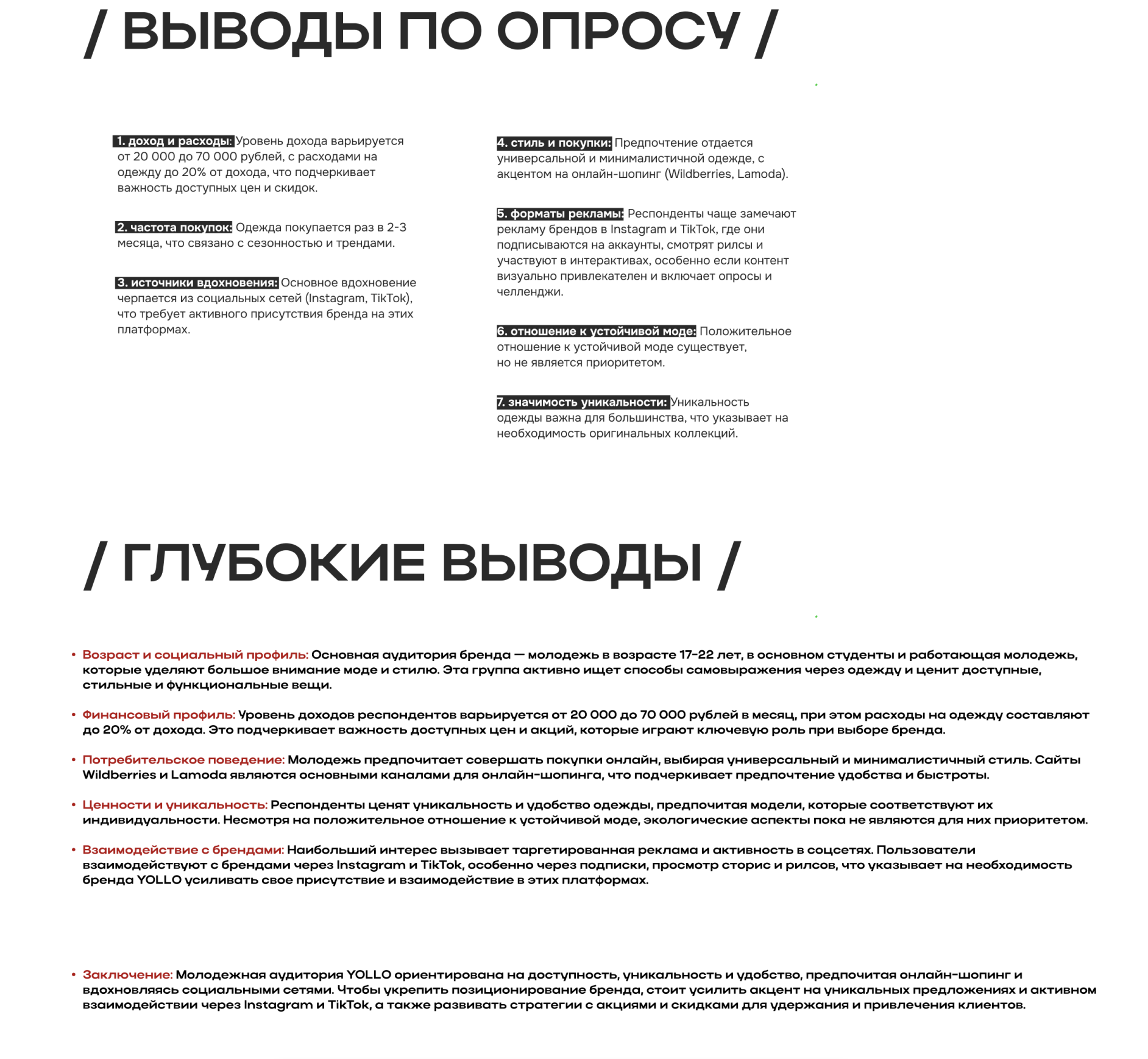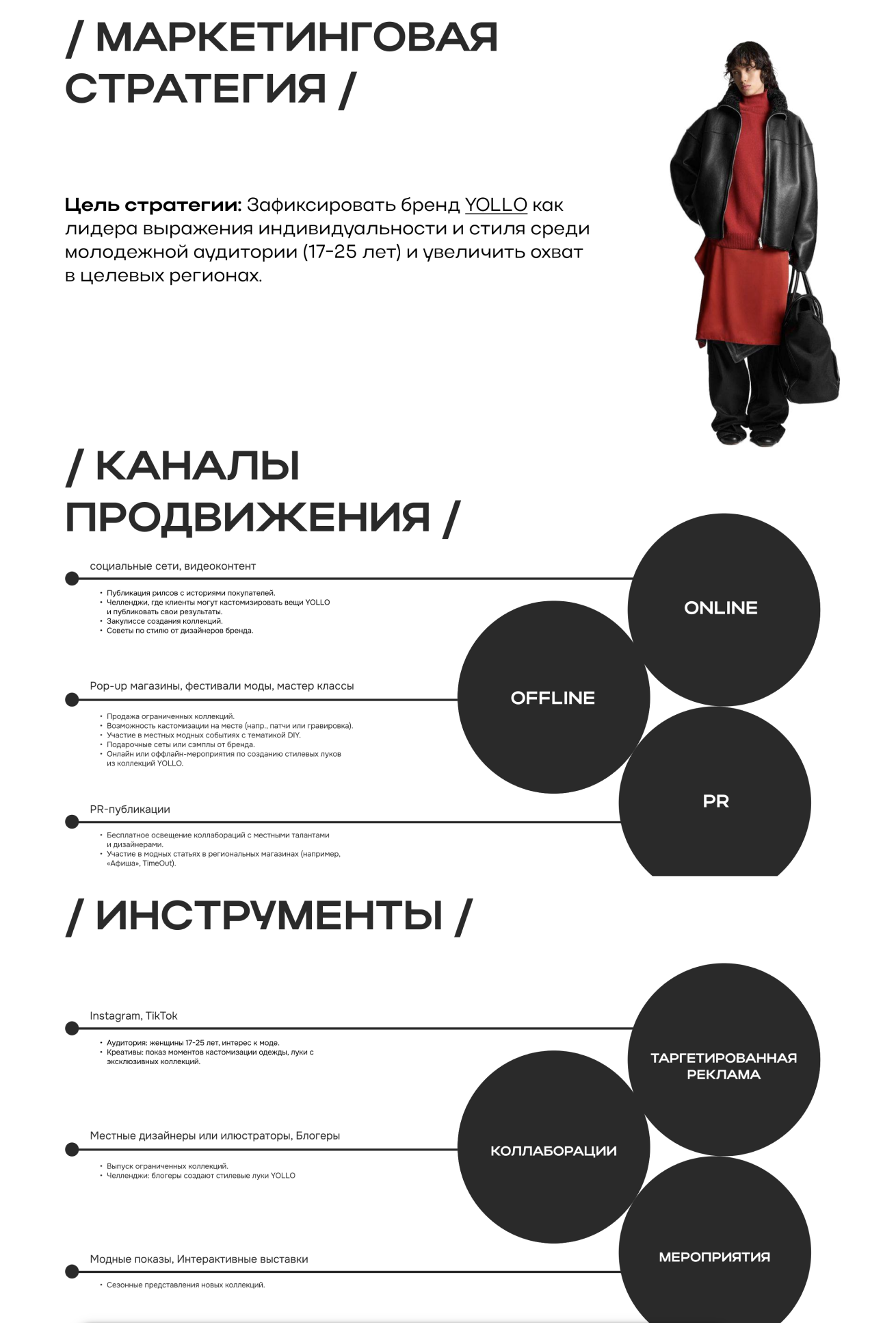В работе над проектом YOLLO мы двигались поэтапно. Сначала провели аналитику: изучили целевую аудиторию, провели глубинные интервью, проанализировали конкурентов и модные тренды. Это позволило определить ключевые регионы для масштабирования (Казань, Санкт-Петербург, Новосибирск) и разработать коммуникационный план с акцентом на интеграцию с локальными fashion-инфлюенсерами.