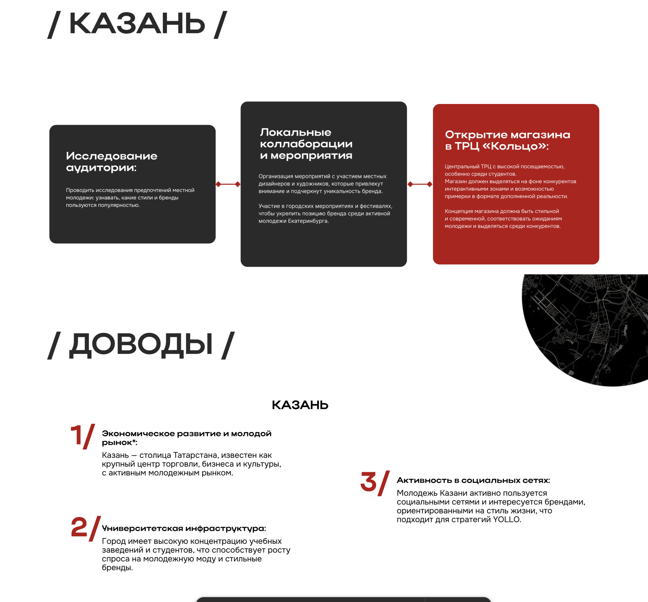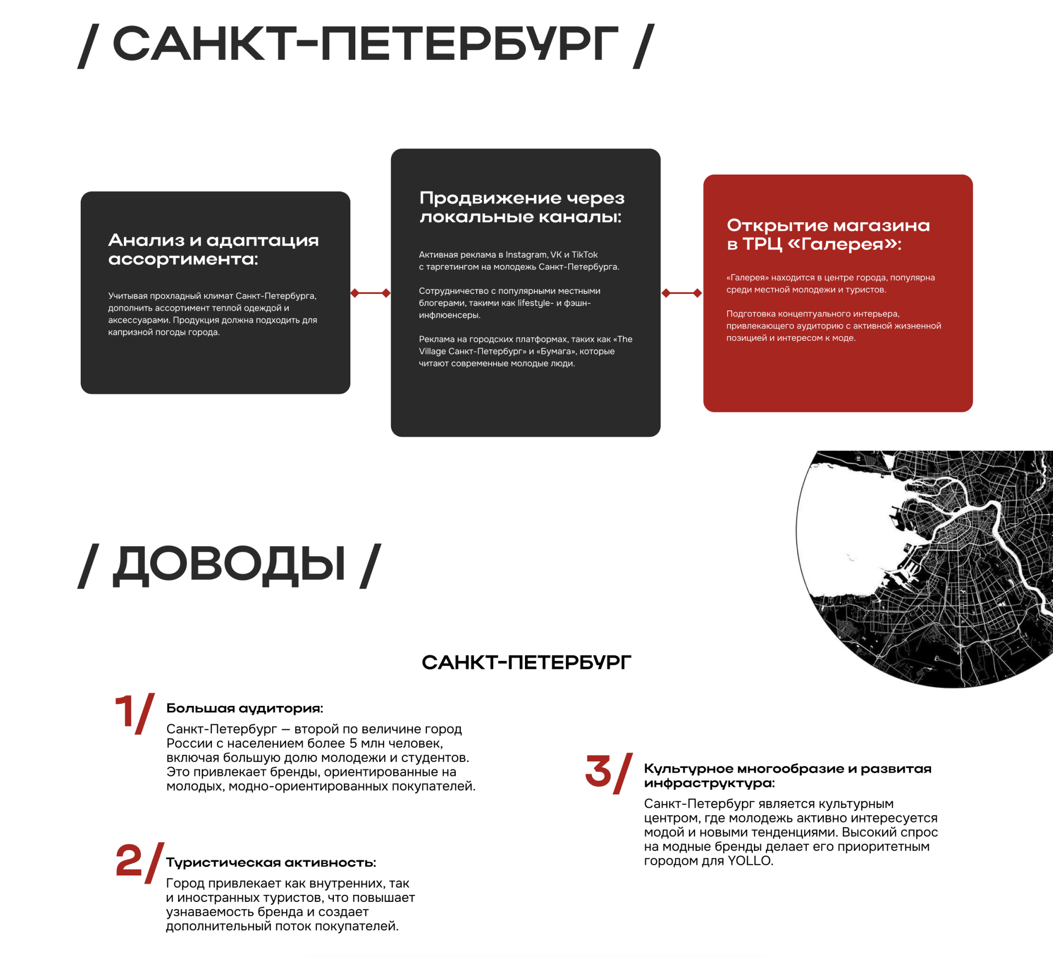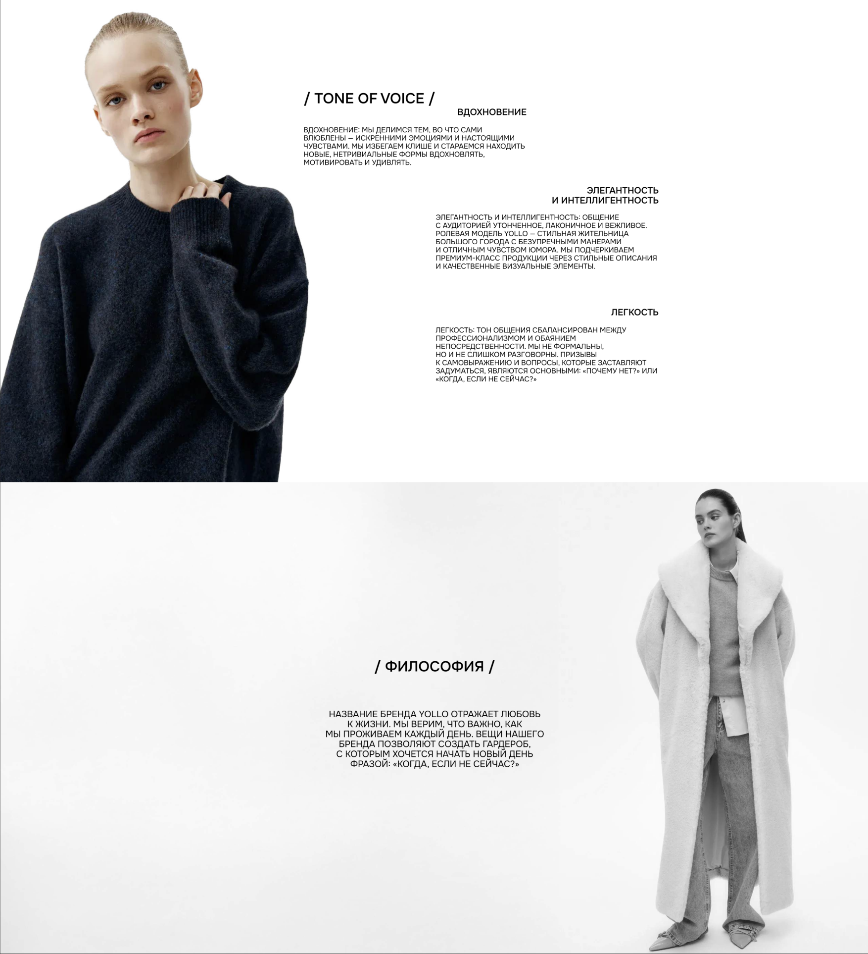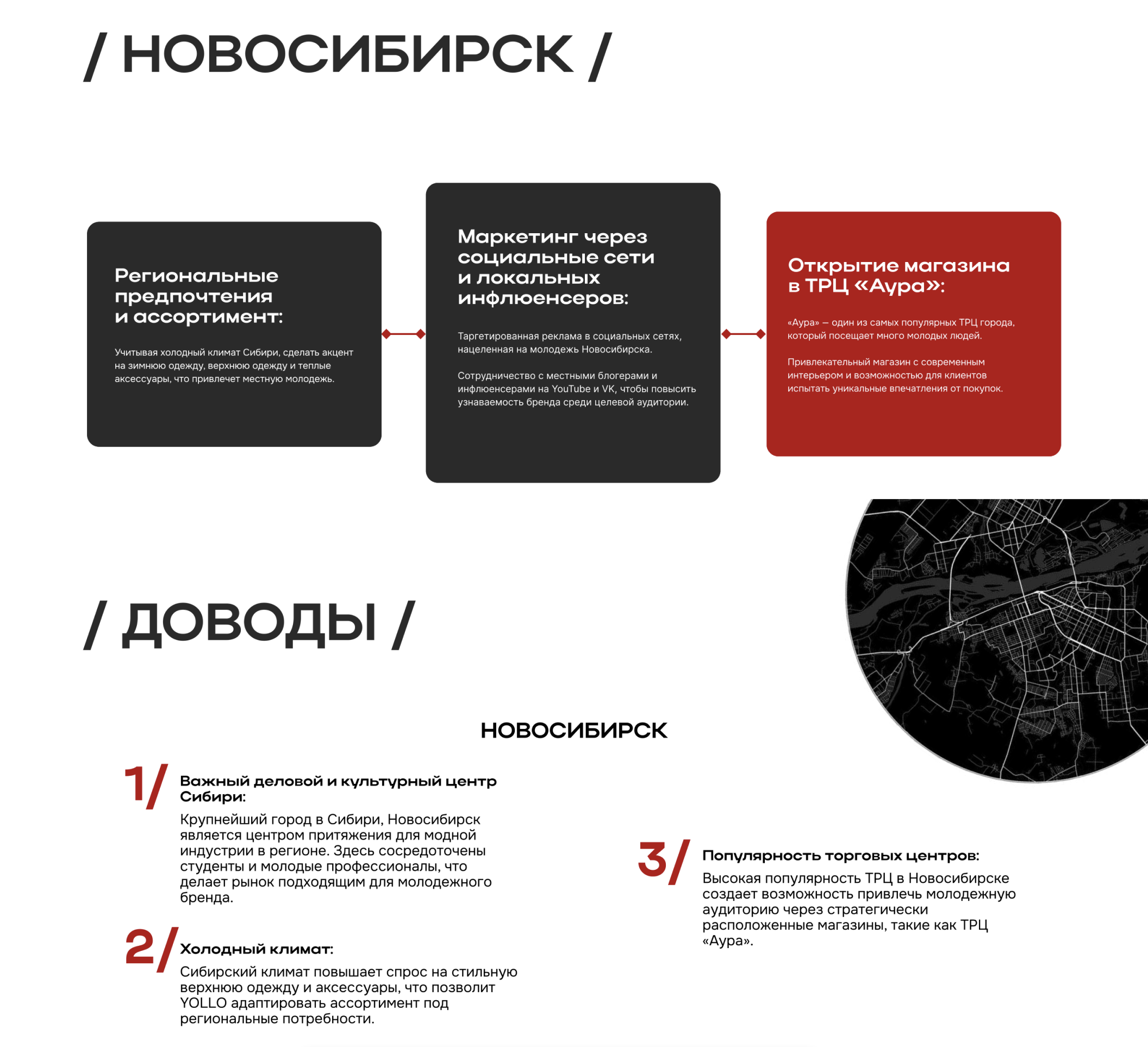 В работе над проектом YOLLO мы двигались поэтапно. Сначала провели аналитику: изучили целевую аудиторию, провели глубинные интервью, проанализировали конкурентов и модные тренды. Это позволило определить ключевые регионы для масштабирования (Казань, Санкт-Петербург, Новосибирск) и разработать коммуникационный план с акцентом на интеграцию с локальными fashion-инфлюенсерами.