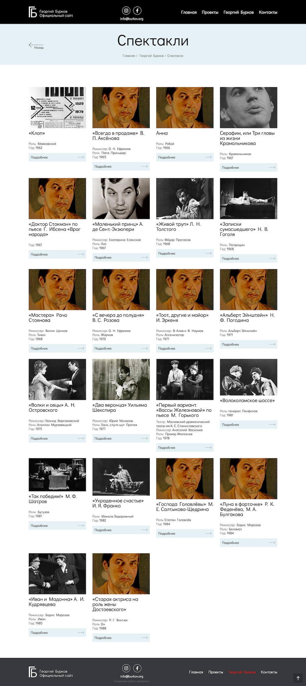 Заказчик — Культурный Центр имени Георгия Ивановича Буркова. Передо мной стояла задача создать официальный сайт, который станет цифровым пространством памяти и развития творческого наследия актёра. Сайт должен был выполнять сразу несколько функций: быть информационным центром для широкой аудитории, площадкой для публикации афиши, новостей и проектов, а также аккумулировать уникальные материалы — фотоархив, биографию, фильмы, спектакли и книги.