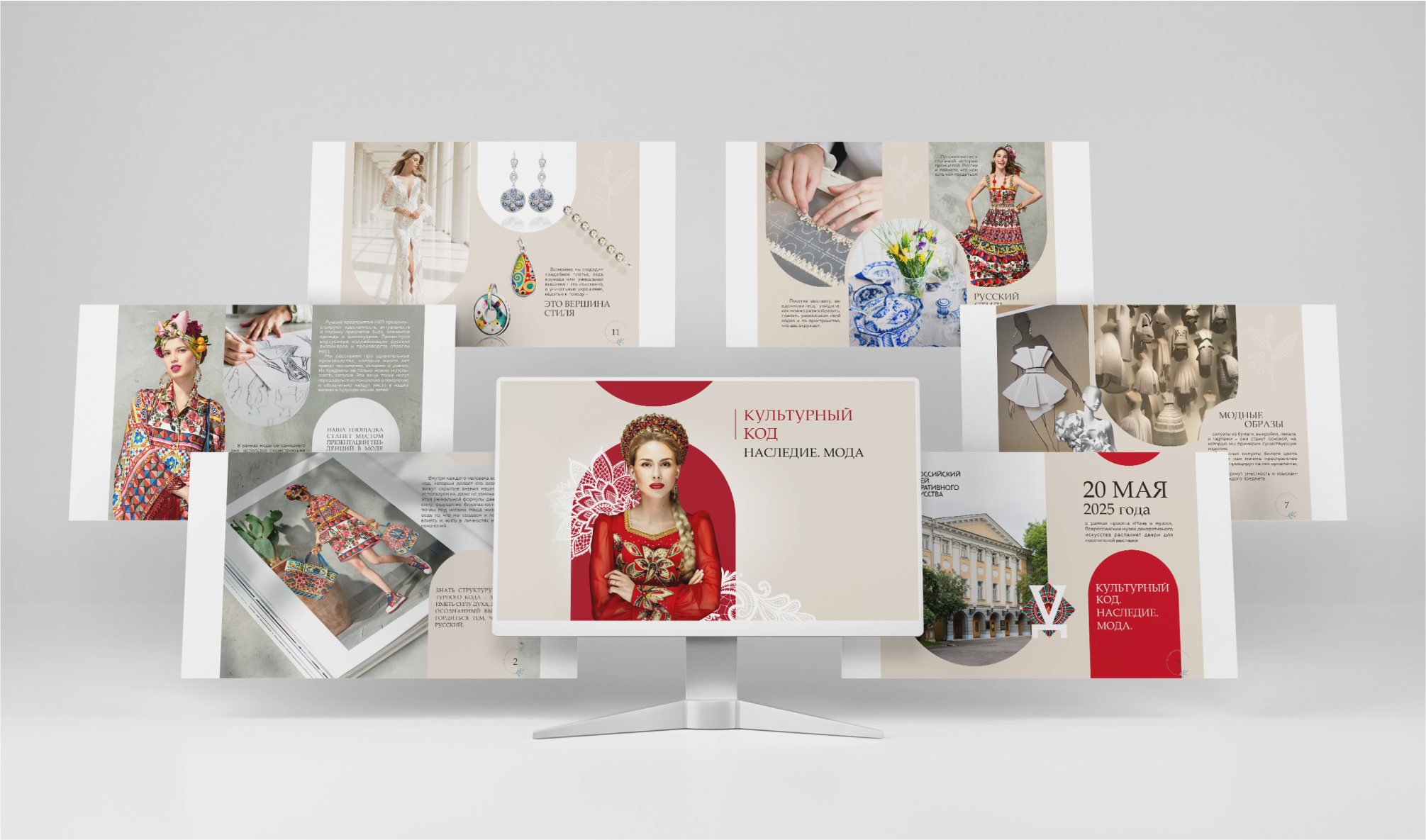 Всероссийский музей декоративного искусства, обратился ко мне с запросом на оформление презентации в рамках проекта «Ночь в музее». Тема выставки «Культурный код. Наследие. Мода». Площадка этой выставки является местом презентации тенденций в моде на ближайшие несколько лет. Моя работа состояла в объединении, красочной подаче и систематизации всех материалов от дизайнеров - участников мероприятия.