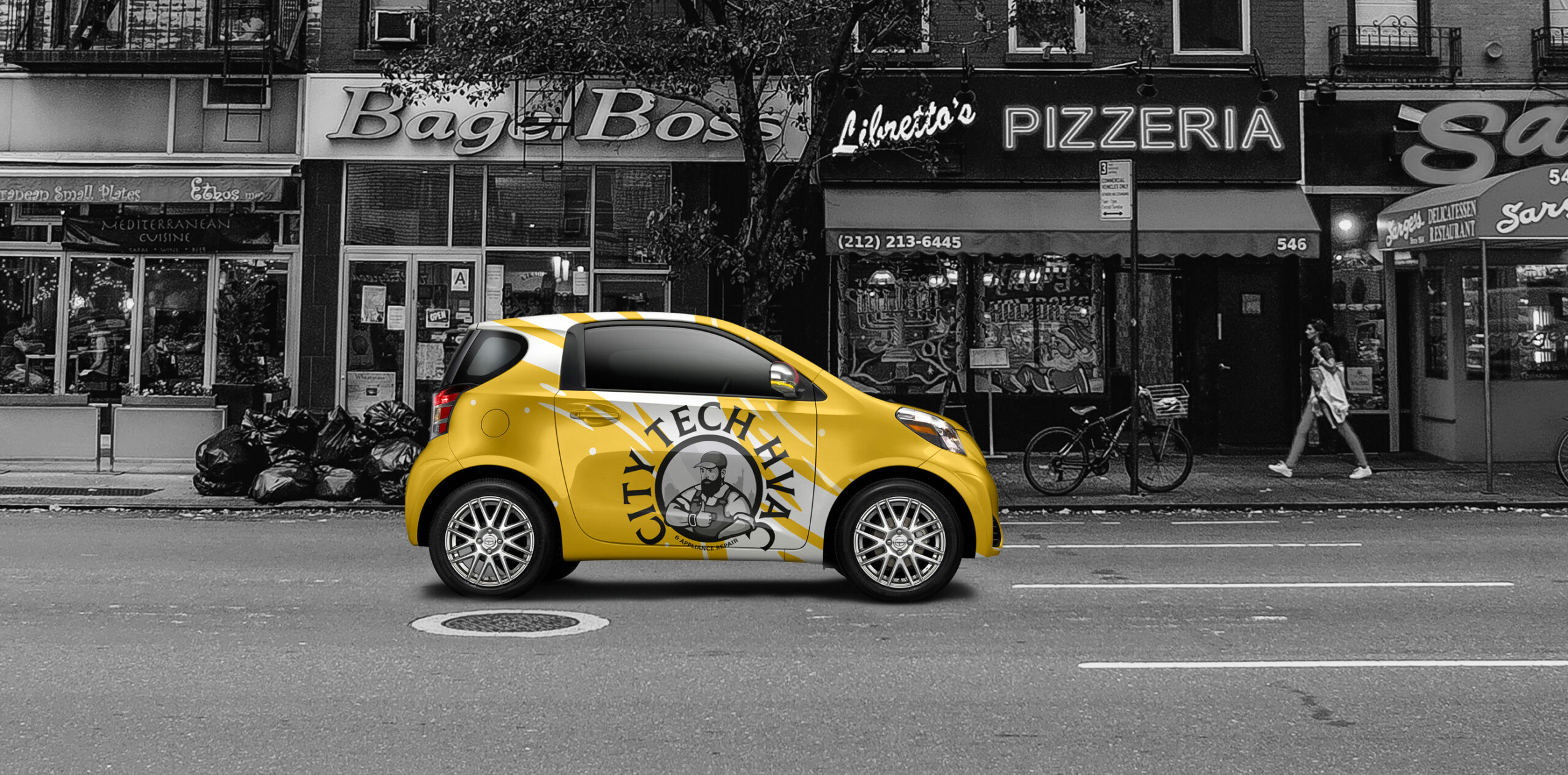 Оформление автомобиля службы: Яркая оклейка или стикер на дверь с логотипом, контактами и ключевой иллюстрацией, привлекающей внимание на улицах Нью-Йорка.