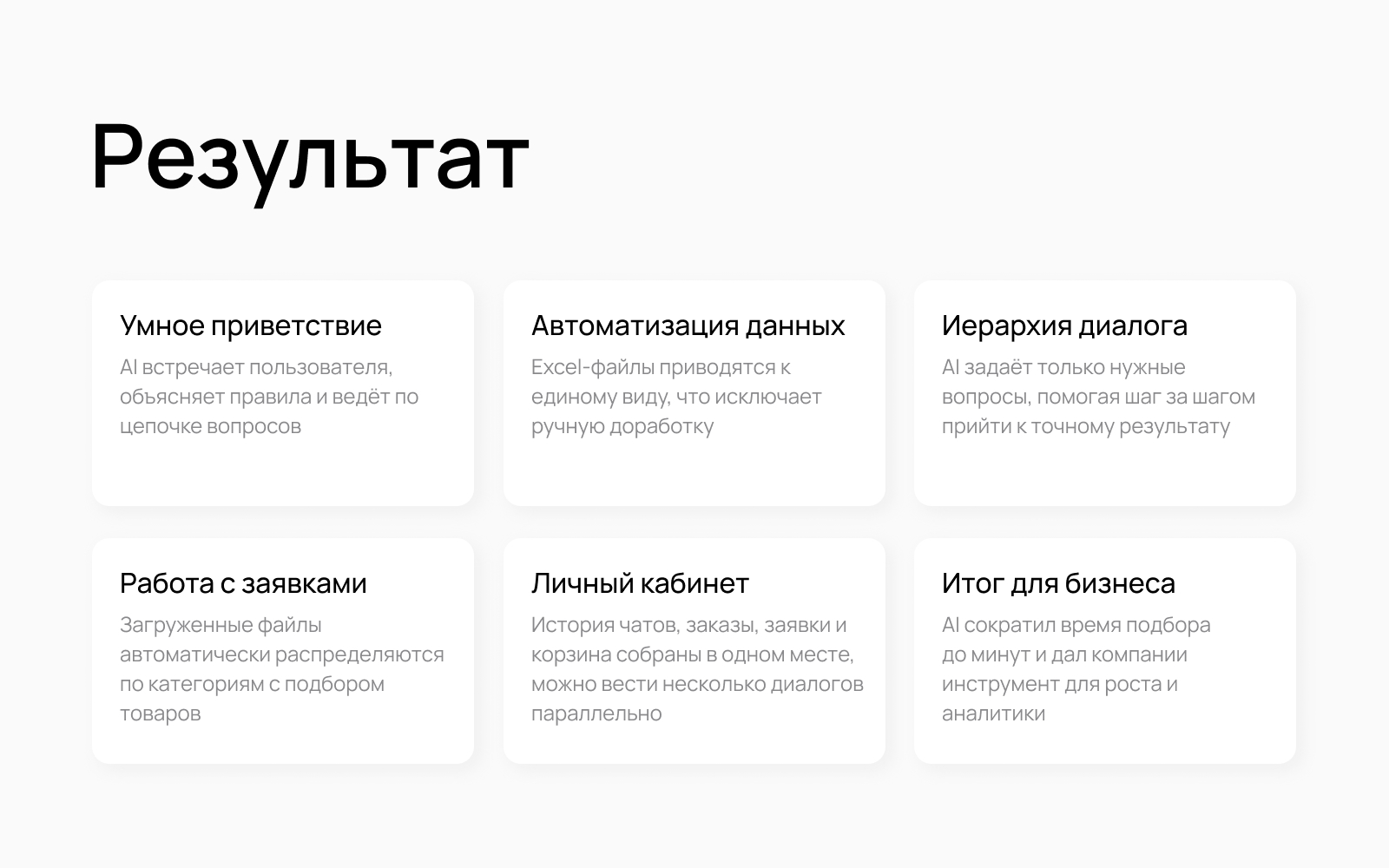 Значимость результатов трудно переоценить. Пользователи больше не тратят часы на подбор — AI справляется с этим за минуты. Заказчик получил инструмент, который одновременно решает задачи клиентов и дает бизнесу ценную аналитику.