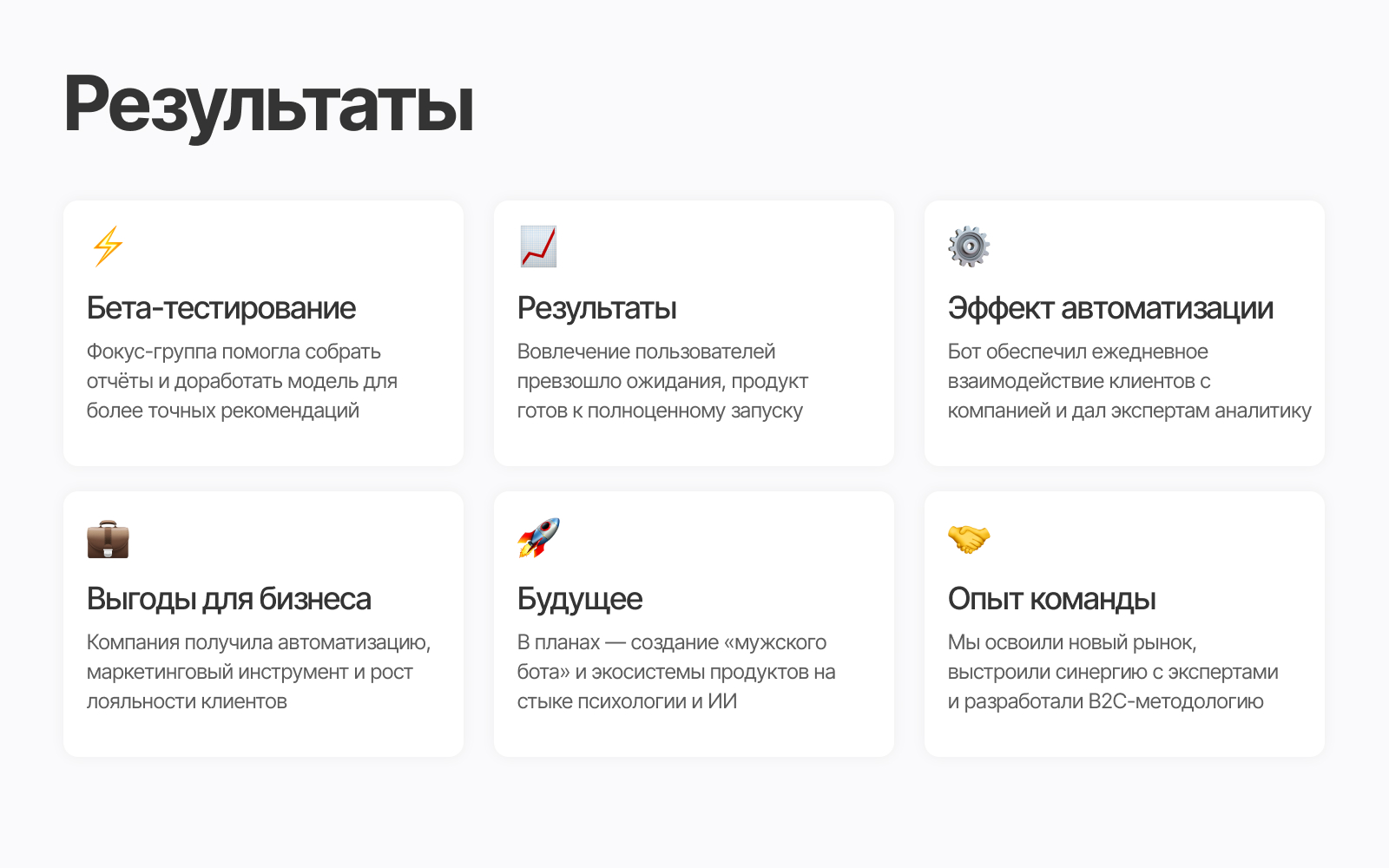 В дальнейших планах — создать "мужского бота" и построить целую экосистему продуктов на стыке психологии, физиологии и искусственного интеллекта.