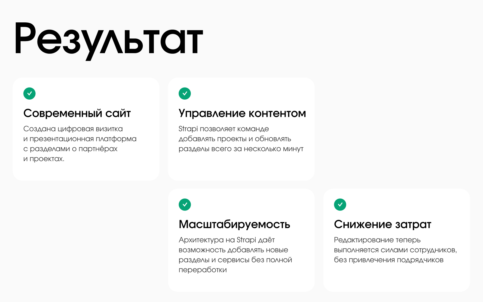 Благодаря Strapi сотрудники компании теперь могут обновлять сайт самостоятельно. Добавить новый проект со всеми фото и описанием занимает около 15 минут, обновить блок с партнерами — меньше 5 минут, внести правки в тексты — сразу через админ-панель без помощи разработчиков.