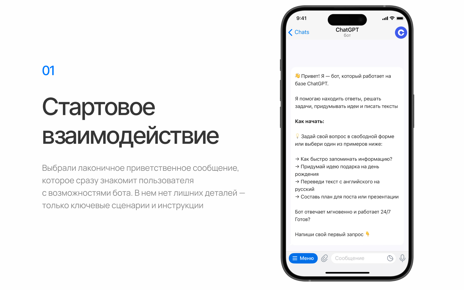 Пользователь не должен думать о технических деталях. Он пишет боту так же, как другу, и сразу получает ответ.