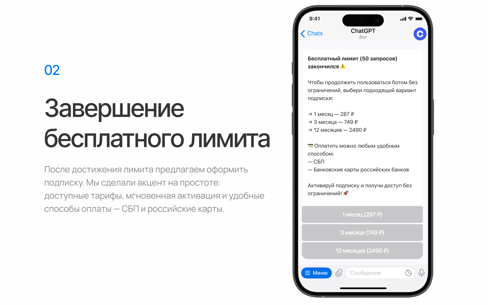 В Telegram невозможно нарисовать полноценный интерфейс, поэтому мы сосредоточились на продуманном диалоге: приветственное сообщение, счетчик оставшихся бесплатных сообщений, уведомления о подписке простым и дружелюбным языком, кнопки для выбора тарифа внутри чата.