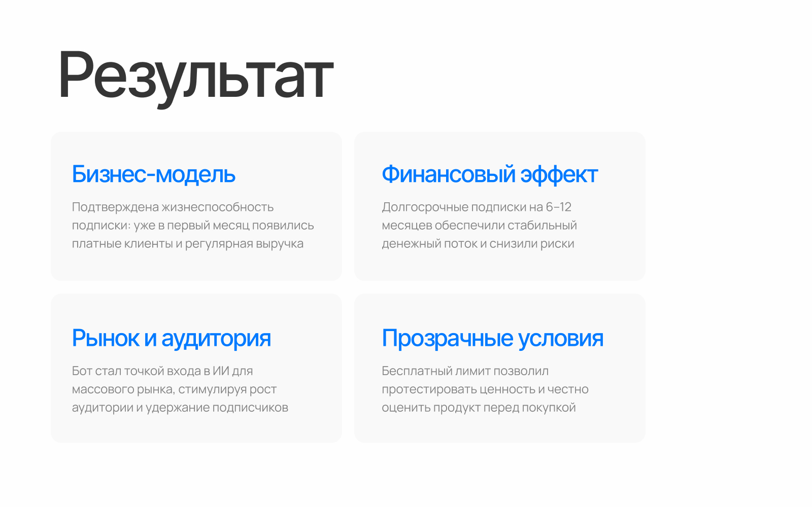 Мы изучили опыт существующих ИИ-ботов в Telegram. Большинство из них имели либо неудобные тарифы, либо не давали пользователям возможность попробовать сервис перед оплатой. Это приводило к низкой вовлеченности и быстрой отписке.