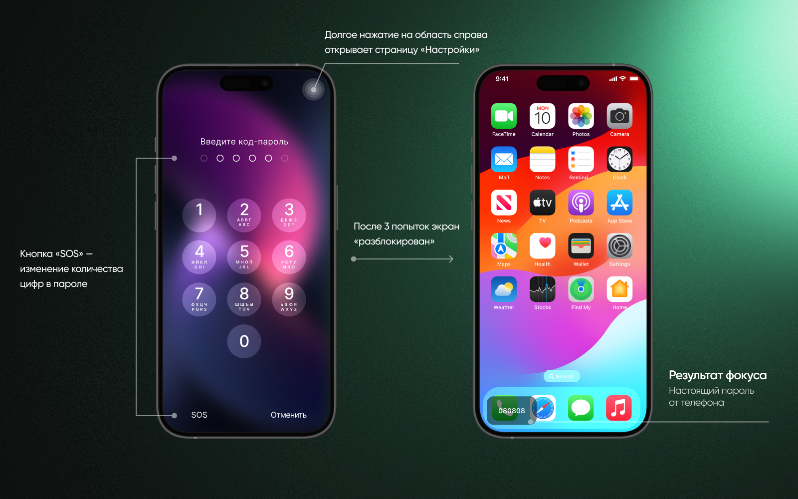 Веб-приложение было выбрано как формат, потому что оно универсально: работает и на Android, и на iOS. Пользователь сам выбирает, какой интерфейс ему нужен — «под iPhone» или «под Android». Для iOS дополнительно предусмотрен выбор блокировки на 4 или 6 цифр, чтобы имитация выглядела максимально реалистично.