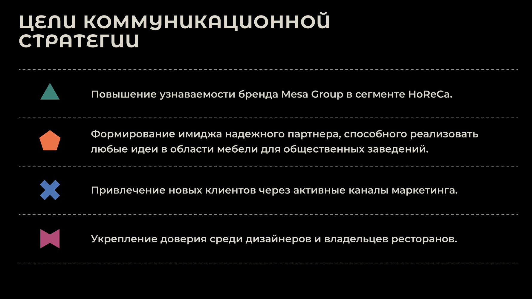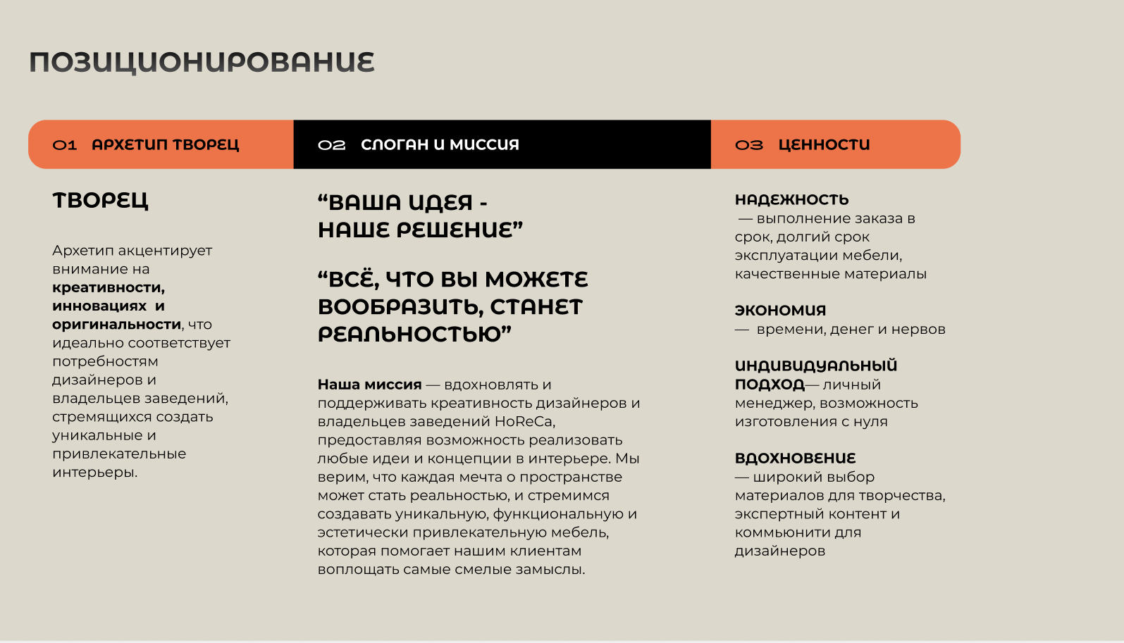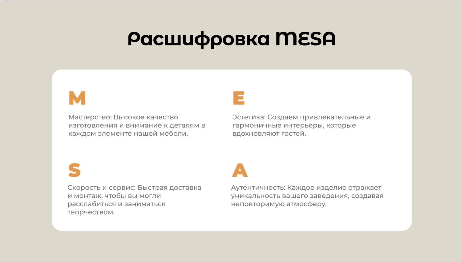 - Определение ценностей бренда (На этом этапе было принято решение - придумать расшифровку названия MESA для транслирования ценностей и ассоциаций с ними: Мастерство, Эстетика, Скорость и сервис, Аутентичность.)