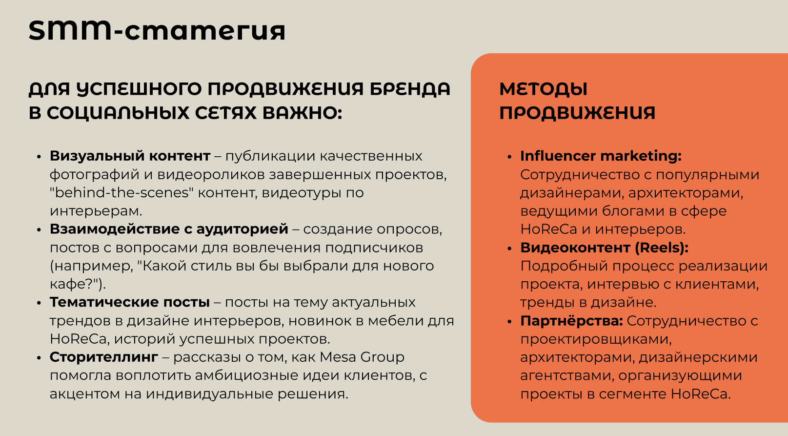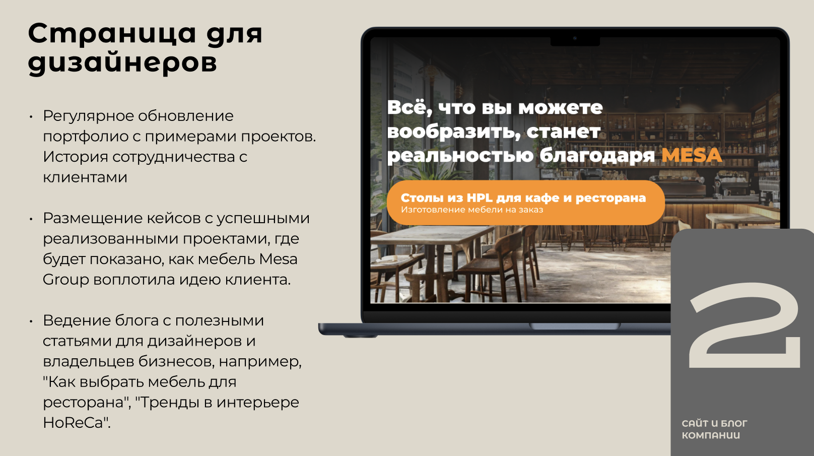 - Разработка предложения по каналам продвижения: обновление и создание новых разделов на сайте (лендинг для дизайнеров), SMM-стратегия для социальных сетей (визуальный контент, сторителлинг, работа с лидерами мнений), продвижение в Telegram, участие в профильных выставках, организация оффлайн-мероприятий (лекции, нетворкинг).