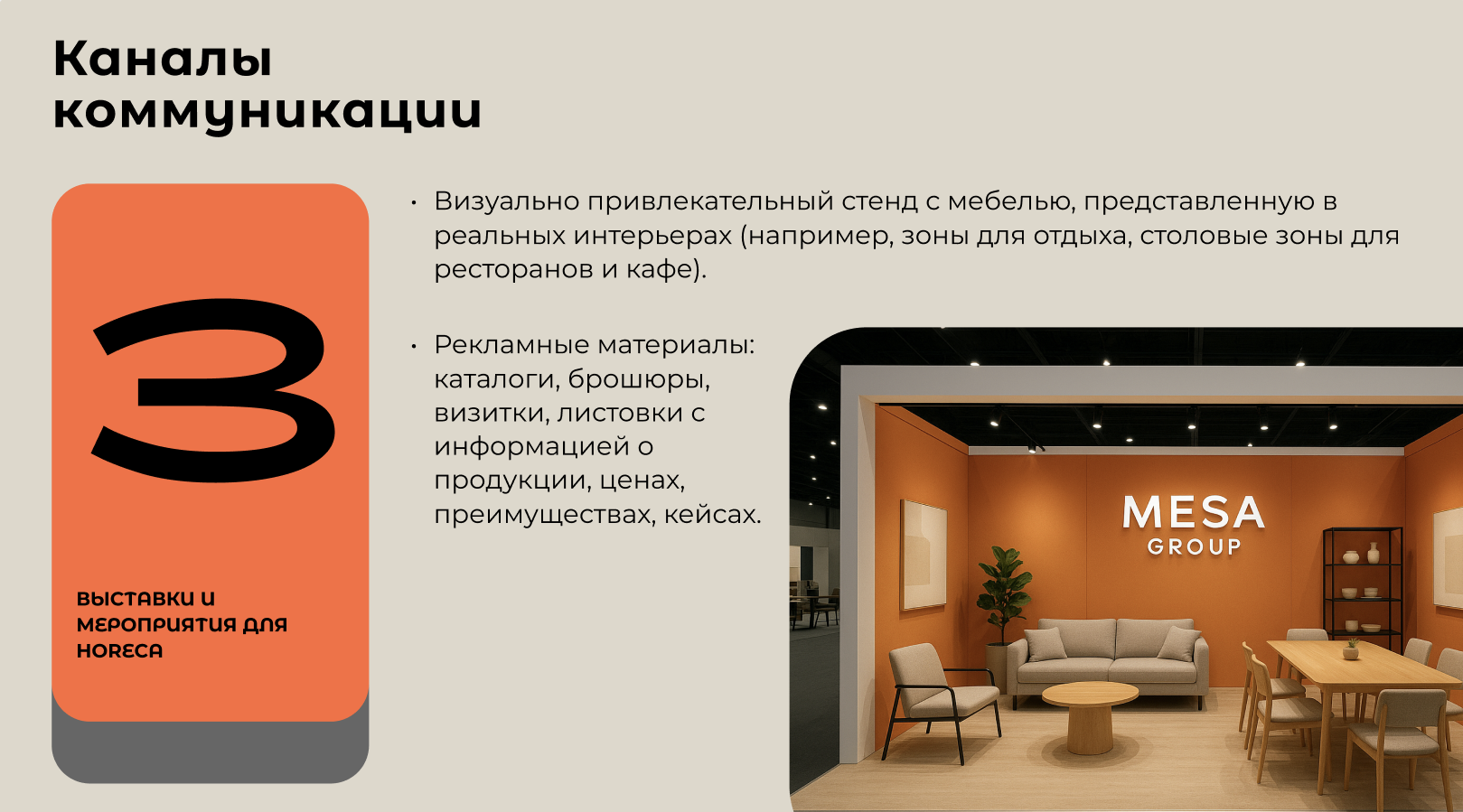 - Предоставлен детальный план коммуникаций, включающий конкретные каналы (SMM, Telegram, выставки, мероприятия) и форматы контента. Также разработаны рекомендации для прямого контакта с аудиторией дизайнеров: создание коммьюнити дизайнеров, проведение мастер-классов, обновление портфолио и сотрудничество со школами дизайна.